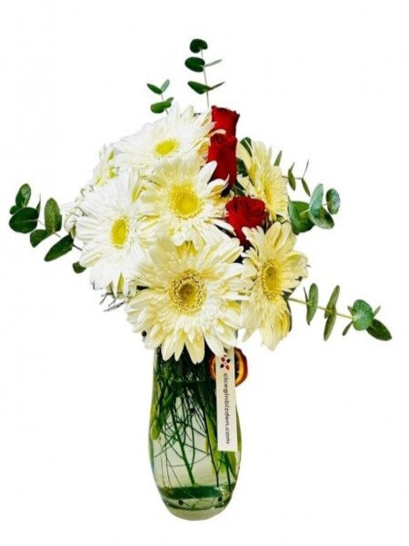 Cam Vazoda Beyaz Gerberalar ve Güller