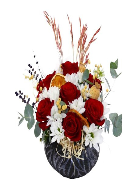 Seramikte Lilyum ve 7 Kırmızı Gül