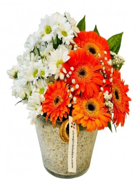 Konikte Beyaz Papatyalar ve Turuncu Gerberalar
