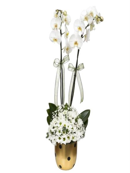 Puantiyeli Saksıda Orkide ve Papatya Aranjman