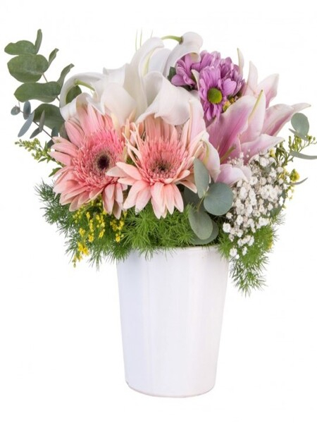 Cam Vazoda Sarı Papatyalar Ve Pembe Güller