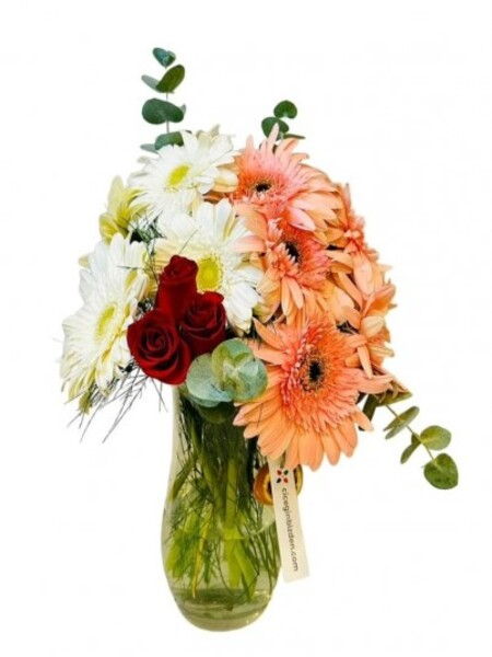 Vazoda Pembe Beyaz Gerberalar ve Güller